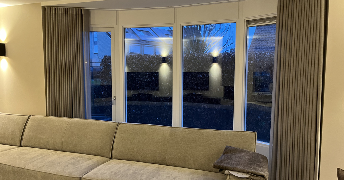 De luxaflex rolgordijnen kleur 5723 op de eerste verdieping bieden een moderne en strakke oplossing voor het reguleren van lichtinval en privacy. Daarnaast voegen de gordijnen van Vriesco Pura kleur 17 in wave plooi in de woonkamer een elegant en vloeiend element toe, wat de ruimte zeker een luxe uitstraling geeft.